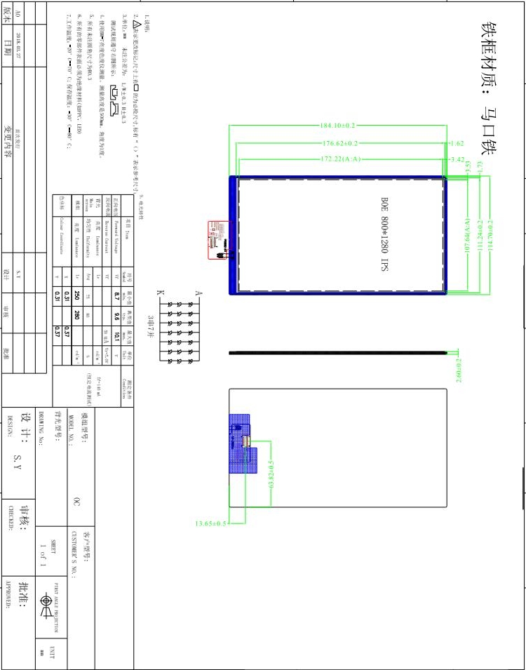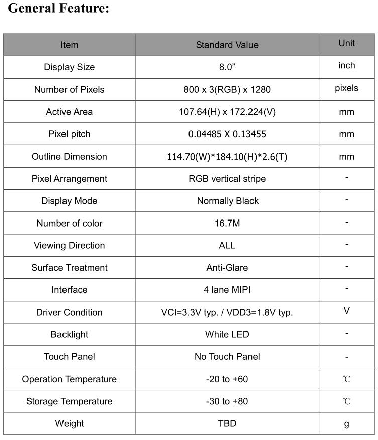 8寸TFT LCD屏 800*1280 MIPI 亮度250 可加TP触摸 IPS液晶显示屏