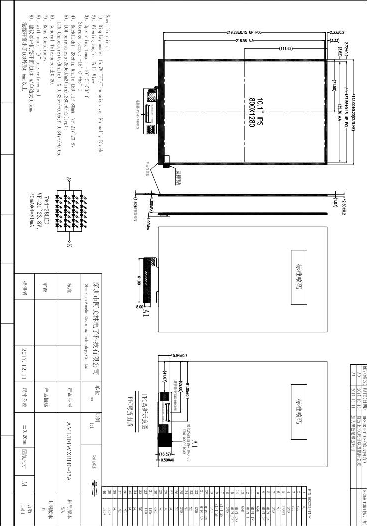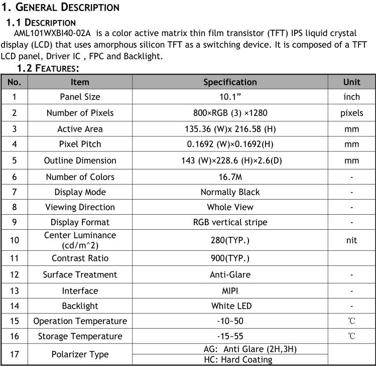 10.1寸 TFT LCD屏 1280*800 MIPI 高清 可带TP触摸 IPS液晶显示屏