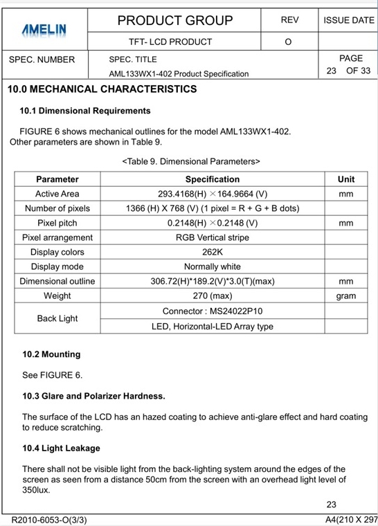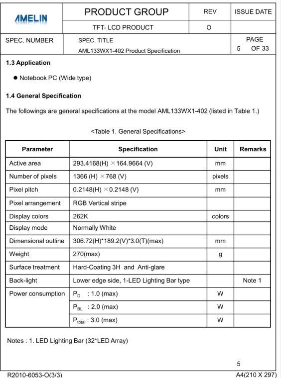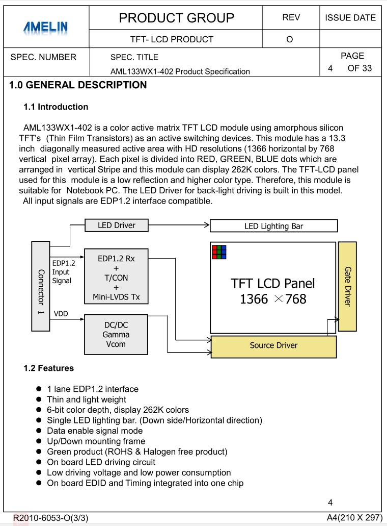 厂家直销 13.3寸显示屏 TFT-TN EDP接口 1666*768分辨率